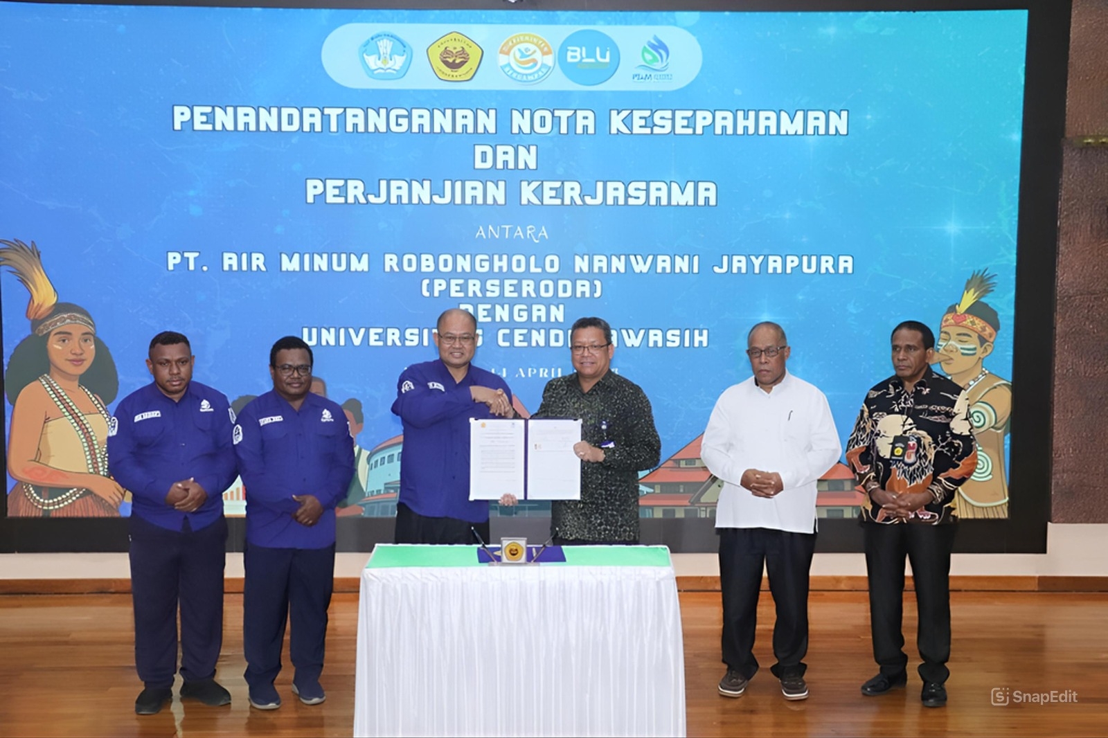 Humas PTAM Jayapura (Perseroda) - PT. Air Minum Robongholo Nanwani Jayapura (Perseroda) melakukan penandatanganan Memorandum of Understanding (MoU) tentang Tri Dharma Perguruan Tinggi dan Penandatanganan Kerja Sama (PKS) Pengembangan Air Minum Dalam Kemasan (AMDK) Uncen Fresh, dengan Universitas Cenderawasih. Penandantangan tersebut dilakukan oleh Direktur Utama PTAM Jayapura (Perseroda) Dr. Entis Sutisna, SE, MAk, MM, Ak, CA dan Wakil Rektor II Bidang Administrasi Umum dan Keuangan Dr. Ferdinan Risamasu, SE, MSc, Agr. MoU dan PKS tersebut sebagai upaya menjawantahkan status Universitas Cenderawasih sebagai Badan Layanan Umum Daerah (BLUD), yang salah satunya adalah produksi AMDK merek Uncen Fresh.