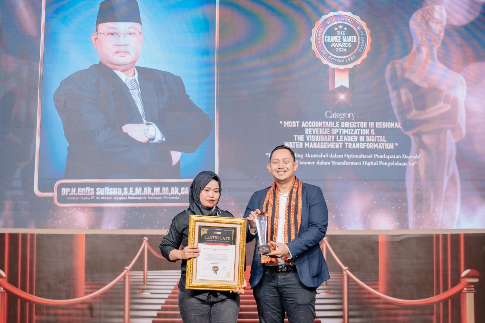 Humas PTAM Jayapura (Perseroda) - Direktur Utama PT. Air Minum Robongholo Nanwani Jayapura (Perseroda) Dr. Entis Sutisna, SE, MAk, MM, Ak, CA, meraih penghargaan kategori Most Accountable Director in Regional Revenue Optimization dan The Visionary Leader in Digital Water Management Transformation pada ajang The Change Maker Awards 2026. Direktur Utama mengatakan, bahwa penghargaan tersebut merupakan pencapaian kolektif seluruh tukang ledeng Jayapura, dalam hal perbaikan sistem dan manajemen perusahaan yang mampu mengoptimalisasi pendapatan, di mana melalui manajemen keuangan perusahaan telah berhasil meningkatkan Pendapatan Asli Daerah (PAD) yang transparan dan akuntabel juga melakukan transformasi dalam layanan.